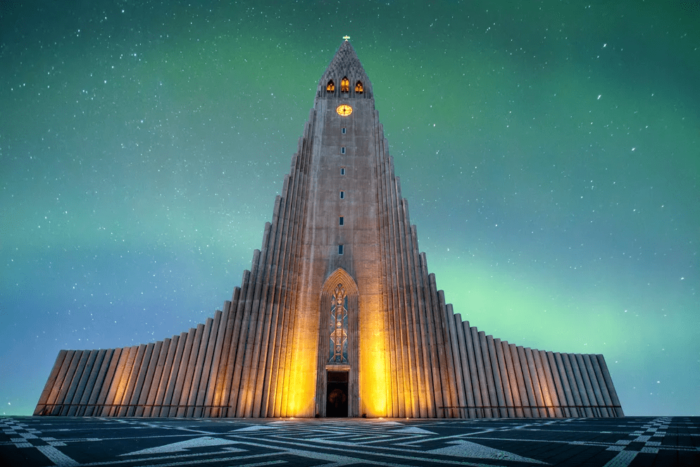 When traveling to Northern Europe, make sure to visit the Arctic Cathedral in Tromsø, Norway. This striking modern church is inspired by the surrounding Arctic landscape, with its sharp, angular design resembling ice and mountain peaks. Inside, the breathtaking “Return of Christ” glass mosaic dominates the space and fills the interior with color and light.